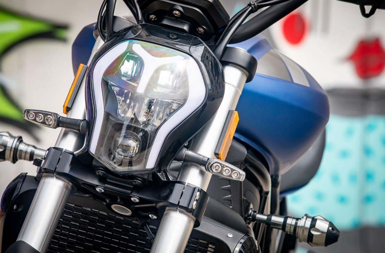 Первое впечатление от 502 С— словно попал на съёмочную площадку фантастического фильма. Фронтальная часть мотоцикла притягивает взгляд: светодиодный «инопланетный» глаз фары, массивный бак, который буквально формирует «тело» мотоцикла и придаёт ему мускулистость. Это не просто дизайнерский штрих, а ключевой элемент образа, делающий мотоцикл узнаваемым с первого взгляда.